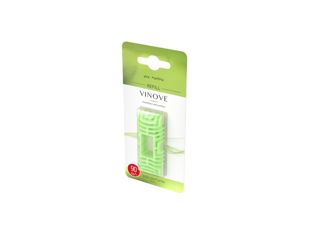 Náhradní náplň pro osvěžovač vzduchu VINOVE, osvěžovač vzduchu do auta určený pro přichycení do mřížky ventilátoru. Kombinuje francouzské parfémy a italský design. Vůně je pomalu uvolňována až po dobu 90 dní při průměrném používání vozu a při mírných teplotách.